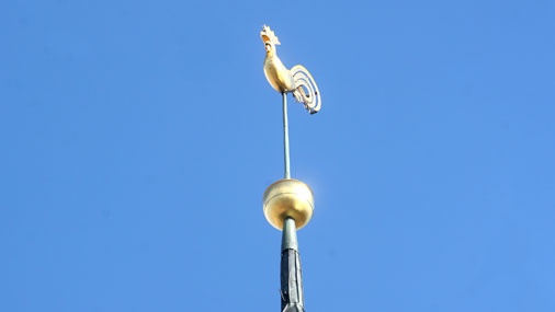 один из символов города. Золотые петушки украшают шпиль Башни церкви Святого